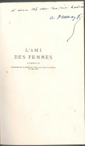 Alexandre DUMAS fils. L’Ami des femmes, comédie en cinq actes, en prose (Paris, Alexandre Cadot, 1864) ; in-8, reliure de l’époque demi-chagrin violet.{CR} Édition originale, un des quelques exemplaires sur papier vélin fort (non...