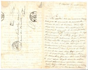 Jules Barbey d’Aurevilly (1808-889). L.A.S. « Jules Barbey », Saint-Sauveur mercredi soir [10 octobre 1832], à Guillaume Trébutien, « libraire » à Caen ; 3 pages in-8, adresse avec cachets postaux (petite réparation à un angle...