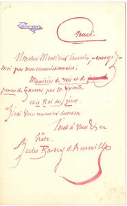par son commissionnaire les Manières de voir et façons de penser de Gavarni, avec l’étude de Charles Yriarte, et Le Roi du jour »...{CR} Valognes lundi 18 [octobre 1880], à son éditeur Dentu. Il est retenu pour quelques jours à Valognes par une affaire d’argent, et il le prie de lui envoyer « trois exemplaires du Goëthe [Goethe et Diderot], que je voudrais offrir à des amis compatriotes »...{CR}
