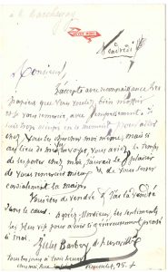 Jules BARBEY D’AUREVILLY. L.A.S., Vendredi, [à Paul Marchegay] ; 1 page in‑8 à la devise Never More, avec la date ornée du dessin d’une flèche. {CR} Sur la Vendée, à l’érudit vendéen Paul Marchegay (1812-1885, surnommé le...