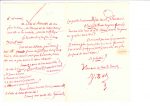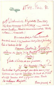 Jules BARBEY D’AUREVILLY. L.A.S., Paris 15 décembre 1881, à son amie Mademoiselle Élysabeth Bouillet [à Saint-Sauveur] ; 3 pages in-8 à l’encre rouge parfois soulignée de vert poudré d’or, à sa devise Never More (petite fente...