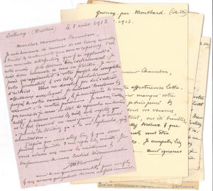 de philosophie, et son projet de faire une licence d’histoire. « Vous ne doutez pas de l’intérêt affectueux avec lequel je suivrai toujours les progrès de votre carrière »... Quincy par Montbard 21 septembre 1913. Vœux pour son avenir ; regrets sur l’« étroitesse incurable des conditions matérielles » de l’enseignement libre... Aix 16 octobre 1913. Il lui propose de donner « quelques leçons d’histoire à un adolescent, de santé délicate »... 28 février 1915. « Je m’unis de cœur à votre peine, à vos prières, à vos espérances chrétiennes, la seule consolation véritable que la mort puisse nous laisser »... 27 janvier 1921. Critiques et conseils après lecture de sa dissertation sur le problème « trop vaste » des conséquences de l’industrialisme ; il faut « concentrer votre réflexion sur les points essentiels », etc. « J’espère que vous pouvez étudier les auteurs philosophiques que vous avez entre les mains, & que vous ne trouvez pas trop de difficultés à les comprendre »... Saint-Seine-sur-Vingeanne 4 septembre 1921. Devant les « difficultés incroyables de découvrir une situation », Blondel va recommander Chambon à un ancien collègue de Lille, Petit-Dutaillis [inspecteur général de l’enseignement secondaire en histoire]... Magny-la-Ville (Côte d’Or) 25 août 1922. Il analyse la situation de Chambon, et s’interroge sur les possibilités d’un poste aux Arts et Métiers de Vierzon, ou de leçons à Rome. « J’espère que la Providence vous guidera vers la meilleure solution, en récompense de votre dévouement, de votre labeur, de votre délicatesse »... 30 septembre 1922. Souhaits de bienvenue à ses nouvelles fonctions de professeur de littérature à l’école régionale de Vierzon... Aix 11 décembre 1922. Vœux après sa nomination aux Arts et Métiers de Cluny. « Je suis remplacé pour l’année à la Faculté par M. Goblot (de Lyon) qui fait des conférences de 2 h½. J’admire ce zèle »... Aix 16 janvier 1923. « Je connais ce vénérable Cluny & je vous suis par l’imagination comme par l’affection dans ces vastes & vénérables bâtiments. Vous saurez vous faire estimer & apprécier [...] Je corrige les épreuves de mon livre sur Ollé-Laprune & je rédige la Pensée »... 15 janvier 1924. Nouvelles familiales, et du « branle-bas » à Aix dans les milieux éducatifs catholiques... 20 février 1948. Félicitations sur son fils Yves Chambon, jeune docteur en médecine. « Nous voici ce matin sous une chute de neige assez abondante et ma santé, si précaire en ma 87ème année, m’oblige à d’extrêmes précautions, d’autant plus que j’ai été pris d’une bronchite aiguë qui m’éprouve beaucoup et m’arrête complètement dans mon travail »... On joint 2 enveloppes autogr. ; une carte-souvenir à son effigie, et qqs lettres de Léopold d’Or relatives aux Amis de Maurice Blondel (1949-1950) ; plus un poème a.s. de César Santelli, L’Enfant malade.{CR}