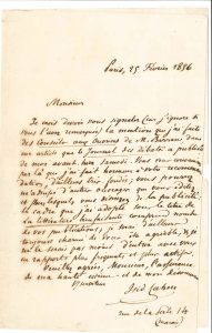 Isidore Cahen (1826-1902) philosophe et journaliste, un des fondateurs de l’Alliance Israélite. L.A.S., Paris 25 février 1856, à Louis Hachette ; 1 page in-8, adresse.{CR} Relative à ses chroniques littéraires.{CR} Il signale « la...
