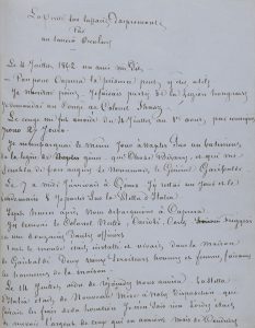 dorés et ornés sur les plats, titre en lettres dorées sur le plat sup., cadre int. avec filets dorés (Sangorski & Sutcilffe), dans une boîte-étui toile rouge.{CR} Important manuscrit racontant la tentative d’expédition de Garibaldi sur Rome et la tragique bataille d’Aspromonte, où Garibaldi fut blessé et fait prisonnier.{CR} Ce récit fut publié dans la Revue contemporaine le 30 novembre 1862 sous le titre La Vérité sur l’affaire d’Aspromonte. Journal de la dernière expédition garibaldienne tenu par un témoin oculaire (p. 225-253, sous la signature d’Alexandre Dumas et daté de « Naples, le 24 octobre 1862 », avec cette conclusion qui ne figure pas sur notre manuscrit : « Ayant eu le bonheur de donner pour quelques jours l’hospitalité à un jeune lieutenant hongrois, proscrit après la bataille d’Aspromonte, il m’a laissé en partant le récit qu’on vient de lire. Communiqué au général Garibaldi, il a été reconnu par lui conforme en tous points à la vérité ») ; le texte de la revue présente quelques différences avec le manuscrit. Le texte fut édité, en traduction italienne, sous forme de plaquette éditée chez Scorza à Milan en novembre 1862, La Verita sopra i fatti di Aspromonte, narrati da combattente testimonio oculare e riconosciti dal generale Garibaldi. Le manuscrit, à l’encre brune sur papier bleu, présente quelques ratures et corrections.{CR} Alexandre Dumas a conçu son récit comme le témoignage d’un participant hongrois à l’expédition de Garibaldi et au combat de l’Aspromonte en Calabre (29 août 1862). Garibaldi veut envahir les États pontificaux pour faire de Rome la capitale de l’Italie réunifiée, et il tente une expédition partie de Sicile avec trois mille volontaires qui débarquent en Calabre ; mais la France fait pression sur Victor-Emmanuel et le gouvernement italien de Rattazzi, et l’armée royale italienne est envoyée, sous les ordres du général Cialdini, pour arrêter les Garibaldiens ; l’affrontement a lieu dans le massif de l’Aspromonte, près de Gambarie ; Garibaldi, blessé et choqué par ce combat fratricide, donne l’ordre de cesser le feu ; il est fait prisonnier, ainsi que ses partisans.{CR} Le narrateur, officier de la légion hongroise, embarque le 4 juillet à Naples pour Caprera, où il retrouve d’autres officiers dans la maison de Garibaldi ; le 14 juillet, ils reçoivent l’ordre de rejoindre Garibaldi à Palerme. À la fin du mois, il part à Nocera chercher une centaine de volontaires parmi ses compagnons, et rejoint Garibaldi (qu’il ne quittera plus dès lors) au camp de la Ficuzza. Malgré le manque d’argent et de moyens, les Hongrois, sous les ordres du colonel Bentivegna, du major Cairoli et du lieutenant-colonel Frigyesi, se rendent à Corleone, où ils reçoivent des souliers et des chemises rouges, puis à Palazzo Adriano et Santo Stefano, où a lieu un accrochage avec l’armée régulière. La troupe, qui manque de vivres, ressent une hostilité croissante de la population, mais continue à avancer : Casteltermini, Santa Catarina, où elle retrouve Garibaldi, entouré de ses officiers et de troupes (3.500 hommes), et ovationné par la population ; puis Castrogiovanni (Enna). Le narrateur décrit les drapeaux, le cachet de la Prima legione romana (avec la devise O Roma ! o morte !) ; il dit le découragement qui s’empare de certains, les désertions, les incidents de la marche vers Leonforte, San Filippo, Regalbuto, Centorbi, Paterno… La troupe régulière laisse passer, sans les inquiéter, Garibaldi et ses chemises rouges ; marche nocturne vers Catane, désertée par l’armée régulière et la noblesse. Accueil enthousiaste de Garibaldi par la population de Catane ; les rangs s’augmentent de déserteurs de l’armée régulière ; « Garibaldi paraissait sûr de son alliance avec le gouvernement » ; on crée une Légion catanaise, et une compagnie de Survivants des Mille ; on organise le corps des volontaires ; faux bruits d’attaque de Catane par la troupe… Le narrateur connaît Garibaldi et le voit quotidiennement : « le bruit courait que le gouvernement avait permis à Garibaldi un débarquement dans le Monténégro, mais lui avait positivement défendu aucun mouvement sur Rome. […] depuis Paterno il était silencieux et morne […] Mon opinion est que le général Garibaldi, jusqu’au dernier moment de son départ de Catane, espéra un rapprochement entre lui et le gouvernement »…{CR} Le 24 août, les Garibaldiens embarquent à bord du Dispaccio et de l’Abbatucci ; traversée terrible, tous feux éteints ; débarquement à Pietrofalcone près de Melito. À Sannazzaro (Lazzaro), Garibaldi reçoit une députation de Reggio, « fidèle au roi et au statut » ; il consent à ne point passer par Reggio. Bombardement du camp par une frégate. Marche jusqu’à la Fiumara ; campement dans le lit du fleuve. En approchant de San Nicolo, première escarmouche entre la troupe et les volontaires ; certains, faits prisonniers, dont le major Salomon, sont emmenés à Reggio ; histoire de la fuite du major Salomon. Marche difficile des volontaires gravissant « les roches appelées Camp di Cardetto ; […] une douzaine de volontaires moururent de faim, de froid et de fatigue » ; sous une pluie glacée ou un soleil brûlant, ils rejoignent Garibaldi à S. Stefano, mais beaucoup « vendirent leurs fusils et se remirent aux mains des autorités. […] depuis le départ de Reggio huit ou neuf cents hommes nous avaient abandonnés. Nous n’étions plus que 18 à 1900 hommes ». Les hommes sont épuisés ; le guide a pris la fuite ; Garibaldi va lui-même couper du bois pour allumer des feux. « Nous étions arrivés au camp d’Aspromonte que nous regardions comme notre Eldorado. La députation de Reggio nous y avait promis des vivres, des secours, des soutiens de toute espèce – nous trouvions un désert ! Nous construisîmes des barraques avec