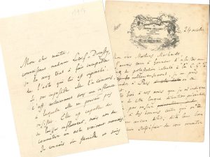 Anatole FRANCE. L.A.S. et L.A. (minute), 1914 et s.d. ; 3 pages et demie in-12, la 2e avec vignette du Château Caillavet.{CR} Paris 20 mai 1914, à un avocat, en faveur de Mme Lecerf-Devasty : « je la crois tout à fait incapable de l’acte...
