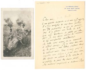 il n’y a au-dessus de mes deux portes que 58 centimètres ce qui ne permet pas d’y placer une toile de 65 avec une bordure si petite qu’elle soit. Je suis donc obligé de renoncer à ces amusantes sorcelleries. Au reste, nous avons en ce moment d’autres soucis. Je ne vous dis rien de la guerre : mes lettres passent dans le cabinet noir. Vous n’avez pas à regretter mon silence : je ne sais rien »... [Taormina 10 avril], carte postale (photo de jeunes gens par W. von Gloeden) à Mme Prouté. « Je m’aperçois que j’ai emporté votre parapluie dans ce pays charmant où il pleut quelquefois. Je crains qu’il n’en revienne un peu malade »...{CR}