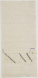 sur 30 lignes. Mme Geoffrin a inscrit les dates de sa naissance (2 juin 1699), de son mariage (14 juillet 1713), celle de la mort de son mari (20 décembre 1749)… Une grande partie du document est consacrée à son voyage en Pologne, à la cour de Stanislas Poniatowski : partie le 21 mai 1766, elle était de retour le 10 novembre après s’être arrêtée, à l’aller et au retour, à Vienne. {CR} Après trois lignes à propos de sa fille, la marquise de La Ferté-Imbault, elle note : « J’ay etée peinte par Nattier en 1738 et ma fille en 1740 […]. J’ay commencee la collection de mes tableaux en 1750, ils ont tous été faits sous mes yeux »… Quelques lignes biffées, écrites par une autre main, probablement celle du marquis d’Estampes, cousin de Mme de La Ferté-Imbault, précisent : « Ces deux portraits qui sont beaux sont dans la chambre à coucher de ma femme. Mme de la Ferté Imbault tenant un masque à la main, vetue d’un domino de bal ».{CR}