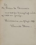 Dédicace au dos, en norvégien, à son traducteur français Pierre Georget La Chesnais (1865-1948) : « Til Mr. Pierre la Chesnais med tak for behageligt möde og i håb om gensyn. Kristiania, den 19 Sept. 1894. Henryk Ibsen » (merci pour son amabilité et dans l’espoir de le revoir).{CR}