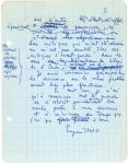 en conclusion aux Entretiens d’Helsinki sur les tendances du théâtre d’avant-garde organisés par l’Institut international du théâtre à Helsinki en juin 1959, et dont Ionesco avait prononcé le discours d’inauguration. Le manuscrit présente de nombreuses ratures et corrections et additions ; il est paginé 1 à 8, 10, 10 bis et 11, puis 12 bis et ter, et enfin 1 à 3 (plus une lettre à Jean Darcante sur la mise au point du texte, qui explique ces discontinuités).{CR} Ionesco aimerait pouvoir répondre à tous les problèmes soulevés, mais il n’est pas « l’enfant Jésus qui enseignait la vérité aux docteurs du temple […] On se demande si la nouvelle avant-garde n’est pas bourgeoise ? […] J’ose penser et déclarer que nous avons perdu le sens d’une communauté humaine profonde. Elle existe, pourtant, cette identité universelle, que je tente de retrouver, comme je peux, [...] je la retrouve cette communauté universelle dans ma propre solitude qui théoriquement est niée, mais qui est celle de trop de gens dans le monde. » On lui reproche d’être désespéré : « est-ce ma faute si l’humanité est désespérante. Et je préfère un désespoir lucide, aux optimismes béats ou de commande. Car la manifestation de ce désespoir est une critique, une protestation, un témoignage. Nous vivons dans le monde de Kafka. On nous reproche d’écrire un théâtre de l’absurde. Mais c’est un absurde que nous constatons et que nous dénonçons »… Les hommes, comme tous les êtres, s’entretuent : « Mais là l’absurde se complique. Car les hommes s’entretuent sous le couvert des croyances souvent nobles qui masquent une sorte d’instinct homicide, d’une haine fondamentale de l’homme pour l’homme ; on a toujours de bonnes raisons de haïr et de tuer : pour la religion, pour la nation, pour sa classe, pour la race, pour le bonheur »... À propos de Brecht (ce passage a été biffé) : « sa tendresse pour le tueur et le couteau qu’il chante dans L’Opéra de 4 sous, exprime un certain goût anarchiste du meurtre que plus tard il régularise [...] Je suis naïf peut-être, mais je suis contre toutes les peines capitales »… Il essaie de définir le « bourgeois » : « Pour moi, c’est le conformiste, l’homme des idées reçues de toutes les sociétés et de tous les points cardinaux. Et si on ne doit pas tuer le bourgeois, on peut combattre l’esprit de la sclérose bourgeoise. [...] Les révolutionnaires n’étaient-ils pas des petits bourgeois ? À tel point qu’il semble qu’une partie de l’histoire pourrait s’expliquer par la lutte des derniers contre les premiers de la même classe »… Dans ses pièces, il ne veut pas décrire la réalité, mais il s’attache « à créer des personnages, à faire surgir librement un monde de mes propres profondeurs. Le poète dit son rêve, semblable à celui de tous ». Peu importent les attentes du public... Il ne renie pas ses origines, et insiste sur sa double appartenance : « la nationalité d’un écrivain est celle de la langue dans laquelle il écrit [...] J’ai choisi le pays de mon ascendance maternelle, sans repousser l’autre ». Il raconte avoir écrit une pièce patriotique à douze ans en France, Pour la Patrie, qu’il a traduite à Bucarest quand il a appris le roumain, et elle est devenue une pièce patriotique roumaine : « Et ainsi je me suis traduit et retraduit, et ces traductions n’ont pas été des trahisons, et les 2 pays ne seront pas séparés dans mon cœur, quoi qu’il arrive, et je suis heureux d’être adopté par l’un, reconnu par l’autre ». Il ajoute une réponse au délégué bulgare, en rappelant que pendant la guerre « la majorité du peuple bulgare et du peuple roumain était pour le nazisme ou la garde de fer », avant de devenir stalinienne sous Staline : « C’est une minorité qui pense, décide. La “majorité” ne fait que suivre ce qu’elle appelle l’histoire. Les révolutionnaires n’ont été que la minorité ». En guise de conclusion, il pense « avoir apporté quelque chose de nouveau par rapport à la façon dont le problème de l’avant-garde, c’est-à-dire du renouvellement, artistique était, jusqu’à présent, envisagé », ce qu’a parfaitement compris le délégué de l’Inde, en déclarant que : « L’homme d’avant-garde est un esprit créateur qui précède ses contemporains et indique la voie nouvelle dans un langage compris d’abord de ses disciples »...{CR} La lettre est relative à la mise au point du texte, où il a rétabli la réponse au Bulgare (« Très important »), et supprimé « les choses personnelles »…{CR} On joint le tapuscrit de la retranscription du début du texte ; et le tapuscrit du discours d’inuaguration des Entretiens d’Helsinki.{CR}