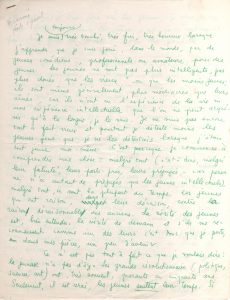 Eugène IONESCO. Manuscrit autographe signé ; 4 pages et demie in-4 au stylo bille vert, avec ratures et corrections.{CR} Intéressant texte sur la façon de jouer ses pièces, et sur le théâtre populaire. Il se réjouit d’être joué par de...