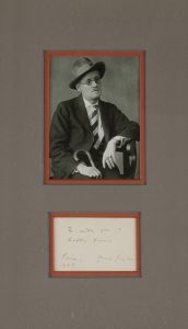 *James Joyce (1882-1941). Carte autographe signée, Paris 1930 ; 1page oblong in-16 ; en anglais (encadrée avec photographie).{CR} « To wish you a happy Xmas James Joyce Paris 1930 ». Il souhaite un joyeux Noël...{CR}