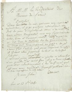 Louis-Sébastien MERCIER (1740-1814) écrivain, conventionnel (Seine-et-Oise). L.S., Paris 13 octobre 1808, aux rédacteurs du Journal de Paris ; 1 page in-4, adresse.{CR} Son article a subi quelques altérations peu importantes. « Mais à ces...