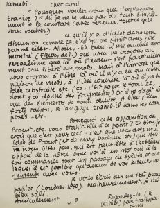 façon de me dénoncer à Gaston, de dire : “vous voyez comment se conduit J.P. à qui vous faites confiance” etc. Ce n’était vraiment pas chic [...] étant donné que G. n’était pas dans la revue, n’y collaborait pas » (10 février [1948])... Réitération du reproche de « dénonciation au patron », alors que « Gallimard n’était, et ne voulait être rien, dans la n.r.f. que je dirigeais » (20 février 1948)... En résumé, « ne comptez pas sur la littérature, l’histoire, la gloire pour donner de la vie à un personnage que vous ne parviendrez pas (ou renonceriez) à animer. [...] Ou encore : ne les introduisez que si vous les avez recréés (c’est une simple règle de romancier, pas davantage) »... (4 janvier 1950)... Il parlait de Sylvia et non de Berl : « surtout ne vous faites pas psychanalyser ! » (mardi)... Envoi d’un discours, pour le convaincre « que la linguistique est tout le contraire d’une science pilote, qu’elle en est encore à discuter péniblement sur sa méthode et que l’étymologie entre autres (dixit Meillet) n’a pas fait un pas depuis Platon » (samedi)... Différend concernant le verbalisme, avec référence aux Fleurs de Tarbes et à Sylvia. « Pourquoi cette apparition de Proust, etc. vous trahit-elle à ce point ? Eh bien, je crois que c’est pour ceci : c’est que vous avez une idée de Proust (et de Mary Duclaux, etc.) que vous ne nous dites pas, qui est peut-être à l’extrême opposé de la nôtre » (samedi)... Remerciements pour Présence, et remarques sur Proust et les confidences ; « la confidence la plus grave qu’il me soit arrivé de faire, c’a été à un étranger, Vandeputte, rencontré une fois par hasard et jamais revu – et mort depuis. Le revoir m’aurait fait horreur » (mercredi)... Il convient de la légèreté de Massis, et recommande d’étaler « tous les embêtements que nous vaudra la constitution de l’Europe. Car enfin, nous n’avons pas tellement envie d’être heureux, nous avons envie de nous sacrifier » (dimanche)... « “Magique”, est-ce bien le mot ? Jusqu’à présent, toute l’ambition des peintres avait été de supprimer l’espace entre les objets. C’est à l’espace vide que le cubisme rend ses droits, sa dignité » (lundi)... Observation acerbe concernant Emmanuel et la « morale bourgeoise » : « vous avez mis pas mal d’eau dans votre vin », cependant son Nasser est « parfait, modéré et violent » (lundi 8 [1968])...{CR}