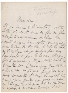 [Suite à une nouvelle loi sur les loyers, au lieu de demander la prolongation de son bail, Proust acceptait de déménager en échange d’une indemnisation financière. La lettre est adressée à Dubois, chargé de pouvoir du banquier.]{CR} « On me donne à l’instant votre lettre où sont une fois de plus redéfaits et comme oubliés les points acquis dans votre conversation avec le duc de Guiche [intermédiaire entre Proust et Varin-Bernier]. C’est la toile de Pénélope et je ne suis pas assez bien portant pour la tisser chaque fois à nouveau. Déjà votre visite de l’autre soir (remarquez que cela n’enlève rien au plaisir que j’ai eu à vous connaître et aux bonnes relations que j’espère garder avec vous en dehors de cela) qui avait pour but de me donner la réponse de M. Varin Bernier s’est conclue par ces mots de vous : “Il faut que j’en réfère à M. Varin Bernier, je le verrai demain ou après-demain”. Et j’ai pensé à part moi : “Je suis ravi d’avoir connu M. Dubois. Mais pour ce qui concerne la maison du 102, qu’est-il venu faire ? Il dit au duc de Guiche qu’il a pleins pouvoir de M. Varin Bernier, que pourtant tout en acceptant les points énumérés il ne peut consentir un chiffre exact d’indemnité sans avoir vu M. Varin Bernier, il me rendra réponse”. La réponse fut dans cette visite… aucune réponse […]. Vous me parlez maintenant de réparations locatives, ce n’est aucune faveur puisque je n’en dois aucune n’ayant rien abîmé, et ayant pris l’appartement sans avoir fait faire les travaux qui m’étaient dus ». {CR} [Correspondance, t. XVIII, n° 77.]{CR}