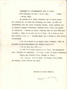 titre Souvenirs de Mauritanie, puis en partie intégré, éclaté et avec des remaniements, dans le chapitre VI de Terre des Hommes, « Dans le désert ».{CR} « Il existe, sur la côte de Mauritanie, aux confins du Rio de Oro insoumis, une portion de sable que l’on nomme, comme une ville, Port-Étienne »… II « Il est onze heures du soir. Lucas revient du poste de T.S.F. et m’annonce pour minuit l’avion de Dakar »… III « À Juby, aujourd’hui, Atar et son frère Mouyane m’ont invité, et je bois le thé dans leur tente »… [IV] « Les empires s’enfoncent dans le sable. Une civilisation efface l’autre »… [Voir Œuvres complètes, Pléiade, t. I, p. 326-330 et 216, 219 et 224).{CR} Ce tapuscrit présente quelques infimes corrections, et un petit fragment collé ; la pagination des feuillets 11 à 16 est de la main de Saint-Exupéry, avec sa signature autographe à la fin.{CR}