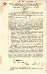 Antoine de SAINT-EXUPÉRY. P.S. avec 3 mots autographes, Paris 28 décembre 1937 ; 1 page in-8 en partie impr. à en-tête de La Nationale (petites traces de rouille).{CR} Formulaire d’accusé de réception d’un Carnet de Passages en Douanes...