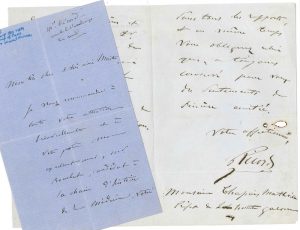 Philippe RICORD (1800-1889) chirurgien, spécialiste des maladies vénériennes. 3 L.A.S. et 2 L.S., 1869- 1884 et s.d. ; 7 pages in-8, certaines à son chiffre et adresse, un en-tête Maison de santé Quartier de l’Observatoire (plus une carte de...