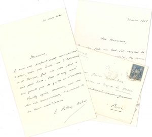 Pasteur. 21 et 29 mai 1886, au sujet d’un article de Tissandier sur Pasteur : « Vous avez su, avec une profonde émotion qui circule à travers les lignes, rendre la physionomie morale de M. Pasteur »... 13 novembre 1888, rendez-vous à l’Institut Pasteur avec Pasteur en personne... 5 mars 1890, envoi d’une dédicace de Pasteur... 24 janvier 1891, compliments de la part de Pasteur pour ses Souvenirs et récits d’un aérostier militaire, « livre plein d’héroïsme » rassemblant « tous les faits d’âme de la guerre »... Plusieurs lettres en février 1892 pour documenter un article de Tissandier sur l’atelier et la maison de Pasteur... On joint une carte de visite autographe et une coupure de presse.{CR}
