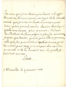 Louis de France, duc de BOURGOGNE (1682-1712) Dauphin de France, petit-fils de Louis XIV, père de Louis XV. L.A.S., Versailles 4 janvier 1700 ; 1 page in-4.{CR} « Jai creu que je ne devois pas laisser echapper l’occasion de vous ecrire, au...