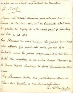 pages in-4, une adresse.{CR} 20 avril à bord du Jérusalem. « Ayant esté detaché Monsieur pour informer tout le Levant de la trêve que Mr de Bandeville a fait avec le pacha de Tripoli le 17 du mois passé, je mouillay icy hier a cet effet. Jay l’honneur de vous envoyer les papiers concernant cette affaire qui m’ont esté remis ». Il regrette de ne pouvoir les lui porter et faire sa connaissance... 25 avril. « Monsieur de Taurin va à Smirne Monsieur pour y prendre les ordres de Mr de Cyventon sur ma destination [...] Jay prié Mr de Taurin de faire en sorte de me trouver quelques médailles et quelque pièce gravée. Trouvez bon que je vous demande pour cela votre aide, et vos conseils »... {CR}