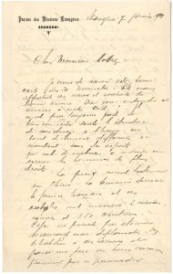 Intéressante lettre sur la situation en Chine. Il remercie Mottez de ses vœux. « La paix revient lentement en Chine. La semaine dernière le prince Touan et ses acolytes ont massacré 2 missionnaires et 350 Chrétiens. Cela ne paraît pas étonner beaucoup nos diplomates. On s’habitue à ces horreurs et pour un peu ces bons messieurs finiraient par se persuader que c’est fort naturel »... L’Amiral Pottier, attendu en novembre à Shanghai, n’est pas venu : « J’en avais entendu dire tant de bien que je ne pouvais m’empêcher de le considérer comme un homme très supérieur. La vieillesse plus que les ambitions doit obscurcir les qualités brillantes dans son esprit, car sur certaines questions cependant très importantes l’Amiral Pottier porte des jugements désespérants. Je ne puis croire que ce soit pour plaire à nos sectaires. Quand on est vice-amiral on se doit à soi-même d’être indépendant de caractère. [...] Nous voilà dans le haut fleuve et j’espère que nous y resterons »... Il annonce l’arrivée d’Olry à Tchongking…{CR}