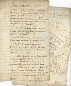 1720) ; testament de Thérèse de Labaune, dame de La Tour Pelegrin (1727) ; diplôme de bachelier ès lettres par Charles-Louis-Guillaume Pelletier (1736) ; déclaration de résidence d’émigrés pour la cause du Roi ; état de services de J.-J. Desvaux baron de Saint-Maurice tué à Waterloo ; certificat de réception comme chevalier de Saint-Louis, par le duc d’Angoulême, pour Gabriel Dezos de La Roquette (nombreux documents à lui adressés)... Notes généalogiques, notices biographiques ; extraits de registres d’état-civil et paroissiaux ; lettres et certificats de service ; correspondance familiale, amicale, militaire et d’affaires ; faire-part ; passeports ; mémoires, quittances ; jugements et extraits des registres du Conseil d’État ; inventaire après décès ; manuscrit dramatique ; ensemble de manuscrits sur la Cochinchine et Mgr Pigneau de Behaine, évêque d’Adran... Documents signés par le comte d’Argenson, le comte d’Astorg, le duc de Beauvillier, Victor duc de Broglie, Victor-François maréchal duc de Broglie, la marquise de Cherville, Louis-Joseph de Bourbon prince de Condé, le général comte de Damas, Pierre-Michel Dubu de Longchamp, le marquis de La Haye-Montbault, le baron de Luppé, le marquis de Marcenay, le chevalier Séguier, l’abbé de Vienne, le comte de Vienne, etc.{CR}