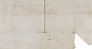 HENRI IV. P.S., Bray sur Seine 27 avril 1590 ; contresignée par son conseiller secrétaire des Finances Henri-Auguste de Loménie, et visée par Philippe Duplessis-Mornay ; vélin oblong in-fol.{CR} Mandement aux gens de ses comptes à Pau en...