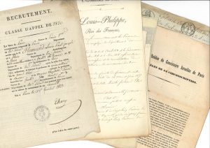 Histoire. Plus de 180 lettres ou pièces, la plupart P.S., L.S. ou L.A.S., 1814-1946.{CR} Certificats de bonne conduite à la Faculté de droit de Dijon et à l’École militaire de Saint-Cyr. Diplôme de bachelier en droit. Certificats de...