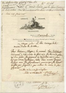 JUSTICE. 3 pièces, 1796-1817. {CR} L.A.S. par E. Chompré, Substitut Commissaire du pouvoir Exécutif près le Tribunal Criminel du Département de la Dyle, Bruxelles 26 germinal IV (15 avril 1796), au concierge de la maison d’arrêt de...