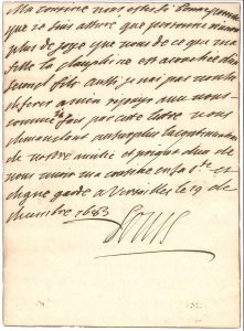 Philippe V.{CR} « Ma cousine vous estes si bonne parente que je suis assuré que personne n’aura plus de joye que vous de ce que ma fille la dauphine est accouchée d’un second fils. Aussi je nai pas voulu diferer a m’en réjouyr avec vous – comme je fais par cette lettre vous demandant au surplus la continuation de vostre amitié et priant Dieu de vous avoir ma cousine en Sa ste et digne garde »...{CR}