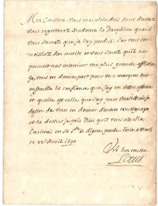 LOUIS DE FRANCE (1661-1711) le Grand Dauphin, fils de Louis XIV. L.S., Marly 22 avril 1690, à une « cousine » ; 1 page in-4.{CR} Le surlendemain de la mort de son épouse la Dauphine, Marie-Anne-Christine-Victoire de Bavière. « Vous me...