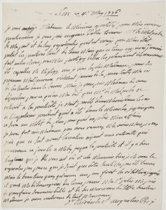 St Augustin R. I. », [Carmel de Saint-Denis] 4 mai 1776, à une dame ; 1 page in-4.{CR} Elle lui envoie les mémoires apostillés pour ses anciens pensionnaires, et la prie en grâce d’aller trouver M. de Malesherbes de sa part « et de luy représenter quil est vraÿs que mon état portoit les pentions tant de tems mais que ce tems expirés j’aurois fait autres choses pour mes protégez selon les places dont ils auroient été capables. Ne négligez rien je vous suplie Madame pour les peauvres malheureux. Réelment jaurois de la peine toutte ma vie de les sentir dans le besoin mais je vous prie Madame de vous dépescher parce qu’on ma dit que Mr de Malzerbe se retiroit à la Pentecôte. Je nait pas été Dieu merci dans le cas de limportuner pendent quil a été dans le Ministere jespère que ce sera un motif de plus pour quil expédie mon affaire »... Elle la presse de venir la voir avant l’Ascension, « aÿant une retraitte qui commence ce jour la a midy jusque la Pentecôte […] vous me dédomagerai du tems passé »…{CR}