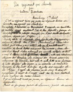 Ludovic Charles Naudeau (1872-1949) journaliste et écrivain. Manuscrit autographe signé, Un Régiment qui chante, [1904] ; 5 pages et quart in-4, ratures et corrections.{CR} Article sur la guerre russo-japonaise, dont Naudeau fut un des premiers...