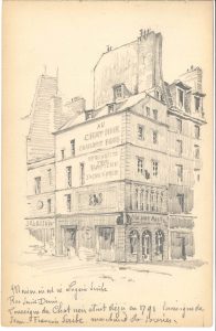 Copie autographe d’Une journée à Fontainebleau, vers inédits d’Octave Feuillet, copiés en 1896 sur un brouillon communiqué par sa veuve.... Dessins à la mine de plomb : « Hôtel de Sens. Rue du Figuier » (22,5 x 31 cm, notes au dos) ; « Maison où est né Eugène Scribe Rue Saint-Denis. L’enseigne du Chat noir était déjà en 1791 l’enseigne de Jean-François Scribe, marchand de soieries » (26,5 x 17,3 cm)..