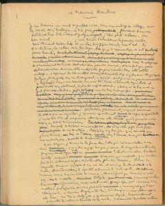 Le manuscrit, d’une petite écriture serrée remplissant toute les pages, écrites au recto, présente des additions en regard du texte ou dans les marges étroites, avec de nombreuses ratures et corrections ; il est daté à la fin « 4 mai 1941 » (erreur de pagination entre les pages 9 et 11).