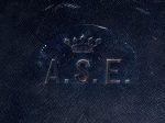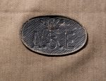Housse de toile beige avec attaches de cuir et pièces de cuir noir aux coins, et rivets métalliques ; sur le dessus, pièce de cuir au chiffre A.S.E. couronné..