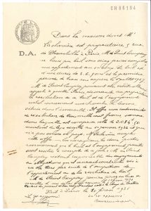 Saint-Exupéry demande la résiliation du bail de son appartement situé 5 rue de Chanaleilles (1er étage) à Paris. Mention autographe « Lu et approuvé » et signature au bas du document, également signé par le propriétaire, M. Laclavière..