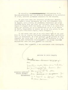 Le contrat d’assurances prévoyait un plafond de six mille francs pour le dépannage éventuel, et la note de frais de M. Raccaud venait en supplément de ce forfait »... Saint-Exupéry déplore une situation extrêmement gênante, étant désormais « responsable de sommes que je ne dois point, et que je ne puis d’ailleurs régler, faute d’argent ». Ici, il ajoute quelques lignes à la main pour signifier son embarras face à un homme « qui a fait preuve envers moi de la plus grande amitié et qui m’a apporté en Égypte l’aide la plus précieuse ». La lettre reprend : « Il est assez amer que je me sois donné tant de mal pour être en fin de comptes lésé aussi gravement, tant matériellement que moralement. Et c’est pourquoi je me permets de vous signaler que votre aide – si elle m’a été précieuse et si je vous en suis infiniment reconnaissant – me plonge cependant aujourd’hui dans les plus grandes difficultés »....