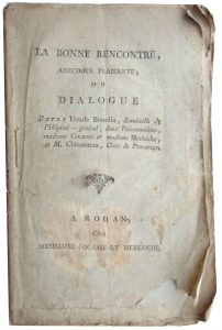 [ANONYME]. La Bonne Rencontre, Anecdote plaisante ; ou Dialogue entre Ursule Bourdin, demoiselle de l’Hôpital général ; deux Poissonnières, madame Cocassé et madame Merluche, et M. Chicanneau, Clerc de Procureur. Rohan, chez Mesdames Cocasse...