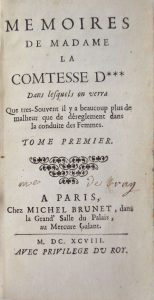 [ANONYME]. Mémoires de la Comtesse D***, dans lesquels on verra que tres souvent il y a beaucoup plus de malheur que de déreglement dans la conduite des Femmes. Paris, Brunet, 1698.