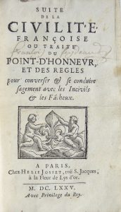 [COURTIN(Antoine de)]. Suite de la Civilité Françoise, ou Traité du Point d’Honneur, et des Regles pour converser & se conduire sagement avec les Incivils & les Fâcheux. Paris, Josset, 1675.