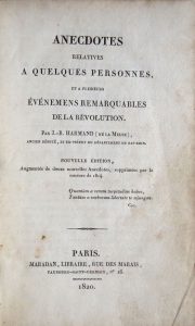 HARMAND ( J.-B., de la Meuse). Anecdotes relatives à quelques Personnes, et à plusieurs événemens remarquables de la Révolution. Nouvelle édition, augmentée de douze nouvelles Anecdotes, supprimées par la censure de 1814. Paris, Maradan,...