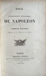 PAGANEL (Camille). •Essai sur l’Établissement Monarchique de Napoléon. Paris, Armand Aubrée, 1836. In-8, reliure demi-chagrin chocolat, dos à 5 nerfs, coins métalliques. Qq. frottements sur les nerfs. (4)-x-2 bl.-428 pp. Qq. rousseurs.
