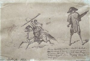 Dessin montrant un cavalier arabe dans le goût de Fromentin ou Delacroix et le Capitaine Castagnette de dos, de ou d’après Gustave Doré, avec une légende en bas à droite :