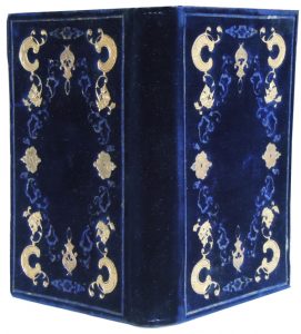 CARNET. Vers 1840. Très joli carnet (15 x 9 cm) en velours frappé bleu nuit, décoré de motifs floraux dorés et d’arabesques en forme de feuillage frappées à froid.