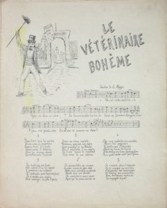 8 ff. ronéotypés illustrés d’un petit dessin en tête, pour autant de chansons avec musique notée : Le vétérinaire bohème, Les quatre canassons, L’interro, Les petites femmes de la clinique … vraisemblablement signées d’élèves de l’école vétérinaire de Maisons-Alfort : Darrou, E. Auger, Hector Lerinat, Davenel…