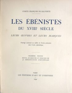 SALVERTE (Comte François de). Les Ébénistes du XVIIIe siècle. Leurs Œuvres et leurs marques. 3e édition revue, augmentée et enrichie de 500 reproductions d’estampilles. Paris, Éditions d’Art et d’Histoire, 1934.