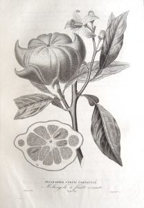 Monographie de référence décrivant orangers, bigaradiers, bergamotiers, pompelmouses, lumies, limoniers, cedratiers ou citronniers …, l’auteur s’intéresse également à la culture de l’oranger en serre sous le climat de Paris, en pleine terre dans le midi de la France, ainsi qu’aux maladies et aux propriétés économiques des orangers.
