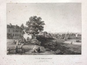 Aquatinte (16 x 33,3 cm à la cuvette) par Louis Garneray, prise depuis l’aire de battage du blé, proche de l’auberge Boutinet d’où partaient les diligences pour Rochefort et Saintes. Rousseurs. Encadrée.