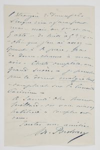 [Début février 1876], à M. Millard : elle est énervée au possible : « Deux mois 1/2 de répétitions pour L’Étrangère de Dumas fils – presque rien à faire pour moi… mais au 1er et au 5e acte... de midi à 5 h 1/2… – Oh ! que j’en ai assez. Quant à la pièce, pas de demi chance à mon avis. Chute complète, ou grand succès. Je penche pour le dernier malgré tout... comptant sur la curiosité parisienne »… Lundi 4 juin [1888], à Dumas fils : recommandation, pour le concours du Conservatoire, de Mlle Louise Marcell, nièce de Bressant et élève de Got. « Je vais écrire à Ludovic qui lui aussi aimait bien Bressant »… 29 avril 1889, au même : « Un de mes bons amis, Paul Gaulot, auteur d’Un complot sous la Terreur, concourt pour un des prix de l’Académie »… 14 octobre 1890, à M. Kaempfen : elle déplore la mort de sa nièce Jeanne Samary : « Le désespoir du pauvre Lagarde et immense »… Jeudi 3, à Mlle Louise : elle la prie de remettre le vol de leurs oiseaux à mardi ; elles conviendront lundi pour le placement du panneau.